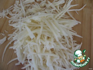 Картофель почистить, потереть на крупной терке (я терла на корейской).Как закипит вода, бросить картофель.