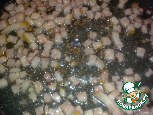 Бекон нарезать кубиками и немного обжарить в сковороде с добавлением растительного масла (так вкуснее).
