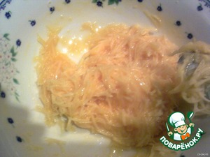 Сверху выложить сырно-яичную массу и нарезанную зелень петрушки. Аккуратно перемешать. От себя добавлю: количество бекона, сыра, яичных желтков и зелени можно выбрать по своему предпочтению.