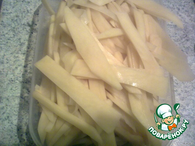 Картофель очистить и нарезать очень-очень тонкими пластинками (в идеале толщина бумаги) по всей длине картофеля (картофель возьмите максимально крупный и длинный).
