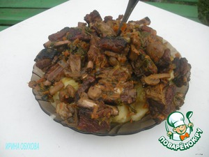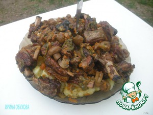 На большое блюдо выложить отварной картофель, а сверху ребрышки с луком, морковкой и грибами.