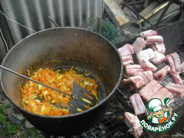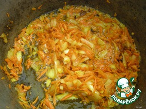 Лук, нарезать крупно, морковь натереть на крупной терке, обжарить в котелке на растительном масле.