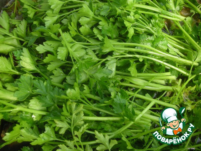 Сверху выложить подкопченные ребра,разломанный гранат (или влить гранатовый сок), зелень (не резать, чтоб потом можно было ее убрать), посолить, поперчить.
