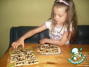 Горячий пласт разрезать на полоски и после охлаждения полить растопленным шоколадом. -