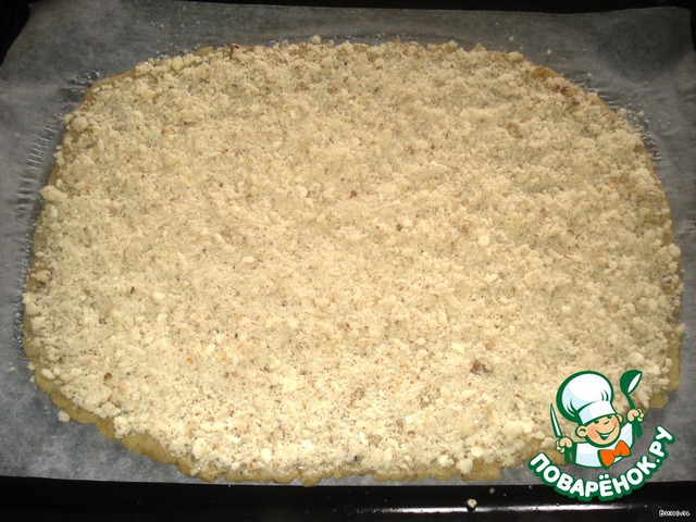 Раскатать на бумаге тесто в пласт толщиной 5 мм, поверхность смазать взбитым белком и посыпать крошкой.