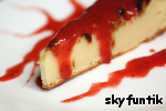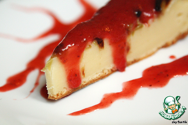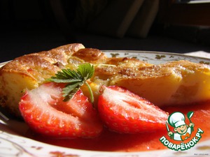 Пока еще запеканка теплая, разложить на порционные тарелки и украсить клубничным соусом.