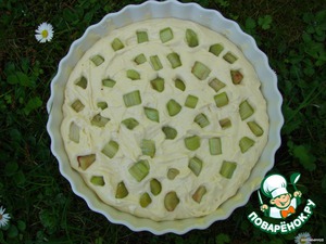 Смешать первые 6 ингредиентов и добавить 2 яйца. Тесто получится гуще, чем на оладьи. По возможности декоративно вдавить в тесто кубики ревеня. -