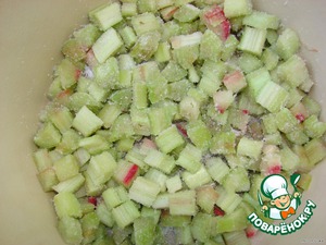 Очистить стебли ревеня от внешнего слоя, нарезать кубиками и засыпать сахаром на 30 мин. Можно сделать это заранее.