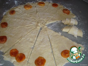 Заранее замоченную курагу уложить на тесто и закатать в рогалики к центру. -