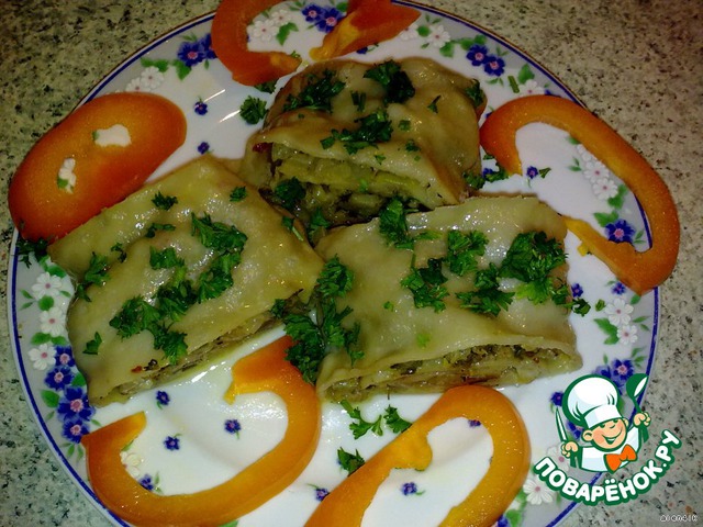 Полученное тесто разделим на 4 части. Каждую часть раскатать в пласт толщиной 2-3 мм. Выложить 1/4 часть начинки