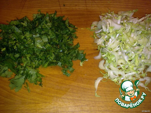Капусту мелко нашинковать, нарезать кинзу (или петрушку – как любите)