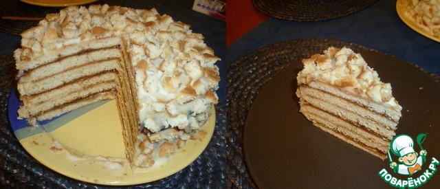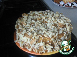 Остальные коржи, бока и верх торта смазать кремом (крема вышло впритык). Бока я обсыпала обрезками коржей. Желательно оставить торт пропитываться на ночь.