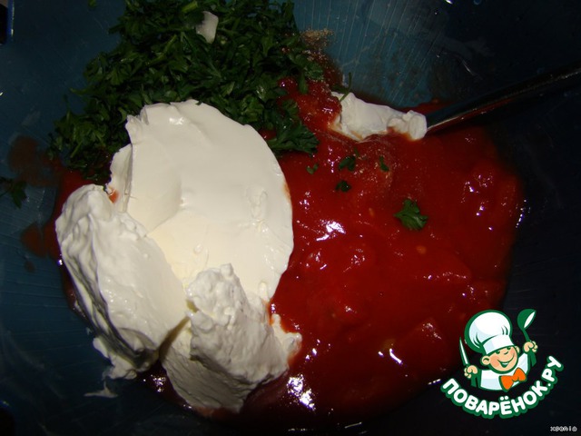 (Томаты берем вместе с соком). Все хорошо перемешаем