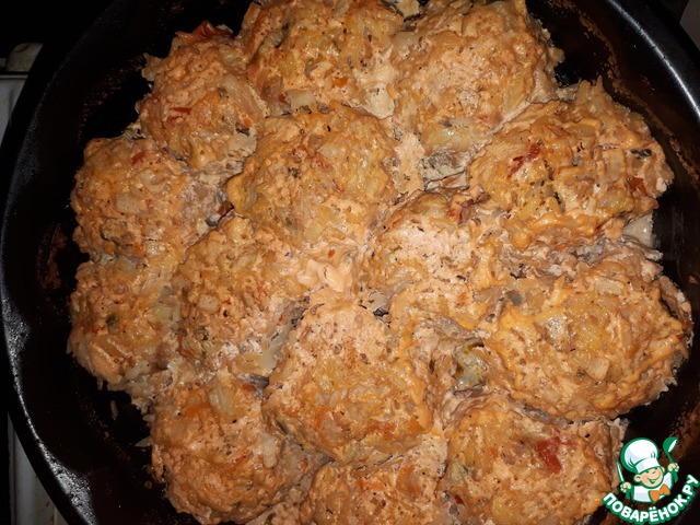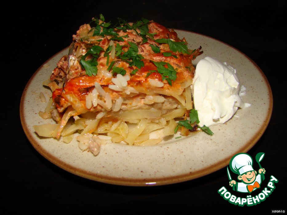 Капусты было мало, но желание вкусно поужинать было большим) Вместо томатов в с/с взяла свежий, плюс при обжарке добавила немного томатной пасты. Рис залила кипятком, как здесь советовали в комментариях (благодарю за лайфхак) - очень понравился этот способ, беру в пользование) Фарш с рисом в виде небольших тефтелек выложила на дно, сверху обжаренные овощи, в качестве заливки майонез с водой и специями, сверху присыпала тёртым сыром. Ужин удался на славу! Мужчины мои оценили по достоинству)
