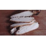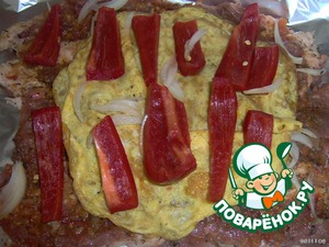 Затем этот пласт отбить,посыпать всякими приправами на ваш вкус,соей полить и маслом раст.сбрыснуть,убрать в холодильник на пару часов.Затем жтот пласт я разрезала на попалам,т.к.большой кусок получился и сделала 2 рулета,испекла 2 омлета,один полажила на мяса,на него перцы косочками и завернула, -