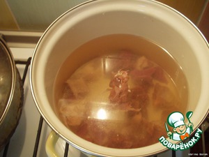 Когда мясо приварится, режем картошку и бросаем ее в суп