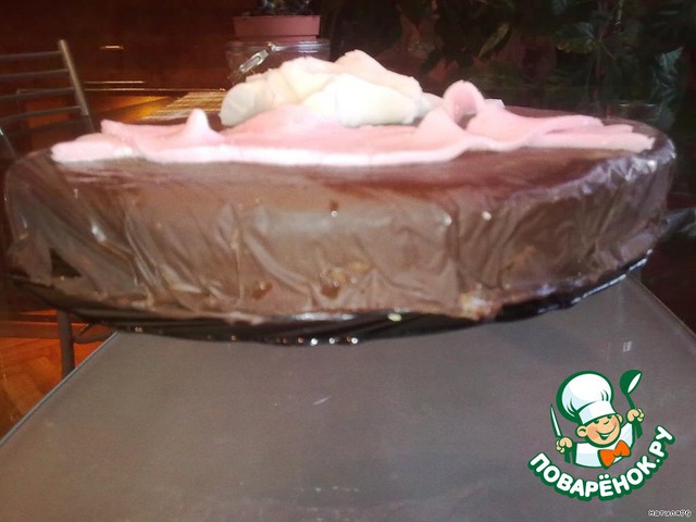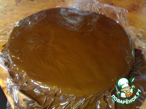 Лишнее обрезаем и убираем тортик в холодильник, пока шоколад не застынет. Пленка остается на тортике!