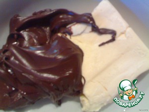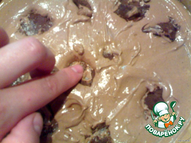 Соединяем шоколадную массу с яичной. Замешиваем не очень жидкое тесто, добавляя муку, разрыхлитель, ванилин и водку.