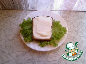 На тарелочку выкладываем 2 листочка салата, а сверху ломтик ржаного хлеба, смазанного майонезом. -