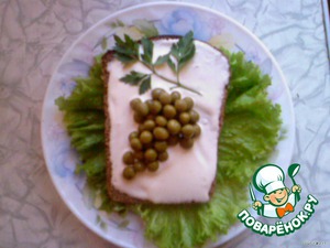 Так же, как и в первый раз, выкладываем листья салата и смазанный майонезом ломтик хлеба. На майонез кладём веточку петрушки, а под ней - из горошка выкладываем виноград.