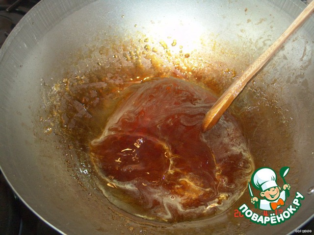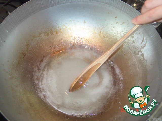 Когда карамель приобрела отчетливый коричневый цвет и характерный запах жженого сахара, постепенно, по каплям, добавляем остальную воду, не давая карамели загустеть.