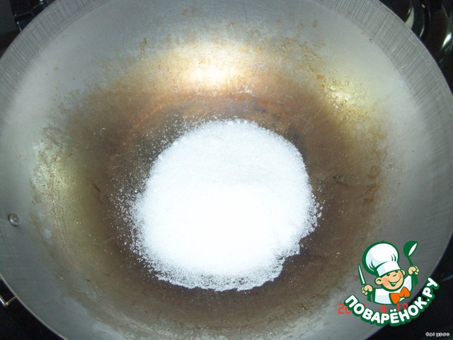 Очень важно НЕ использовать сковороду с тефлоновым покрытием. Сковорода должна быть самая обычная. Я использовала ВОК. Насыпаем сахар на дно сковороды. -