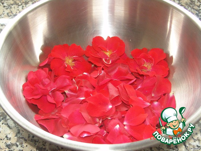 Собираем лепестки от 11 роз, моем проточной холодной водой, даем воде стечь и оставляем в резерве.