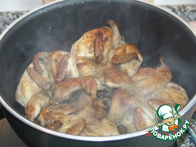 Отдельно, в сотейнике на сливочном масле обжариваем до золотистого цвета мелко рубленный чеснок, укладываем в сотейник перепелов (цыплят), накрываем крышкой, томим ма медленном огне.