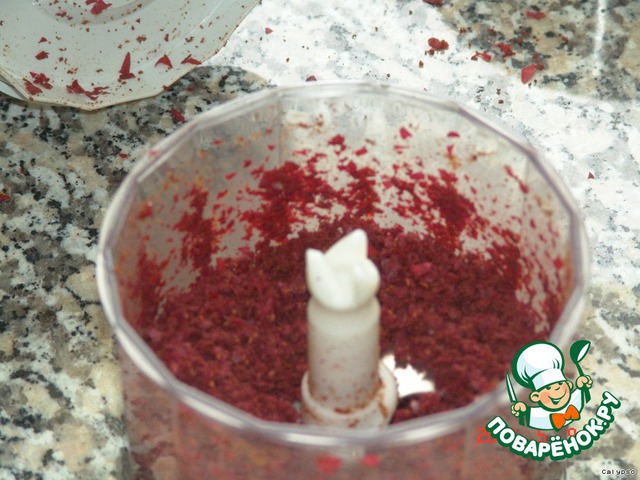 Соединяем с пюре из каштанов. Досаливаем (по вкусу). Добавляем 1 каплю розовой пищевой эссенции.