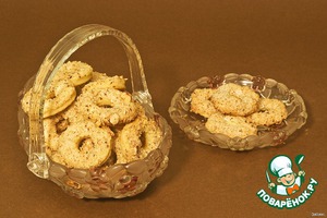 На смазанный жиром противень выкладываем наши кольца, предварительно обмакивая их одной стороной в белок и орехово-сахарную смесь.