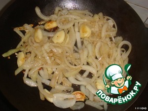 Нарезать лук тонкими полукольцами, чеснок придавить широкой поверхностью ножа так, чтобы он треснул посередине.
