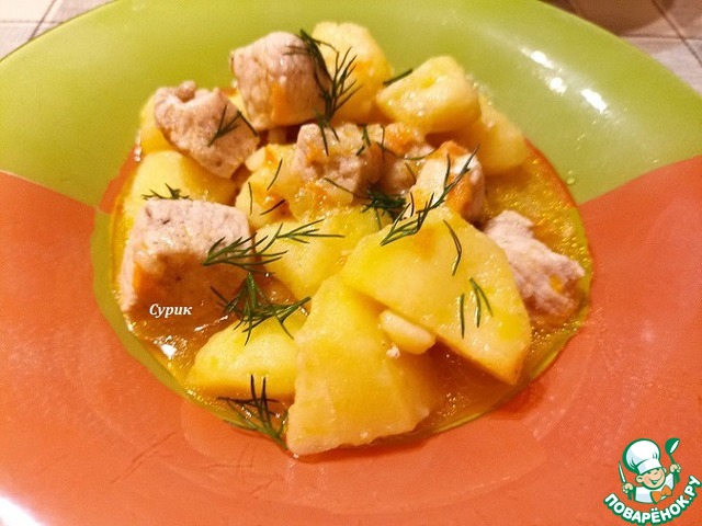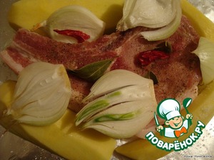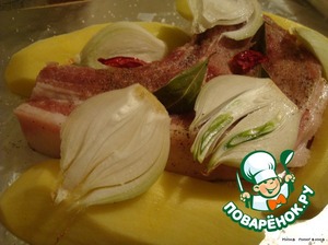 Подготовить овощи. Картофель почистить и нарезать. Лук нарезать на половину. Добавить лаврушку.