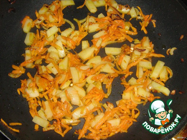 На разогретое оливковое масло бросаем лук и морковь. Когда они слегка обжарятся, кладем к ним и картофель. Все обжариваем до получения на картошечке румяной корочки.