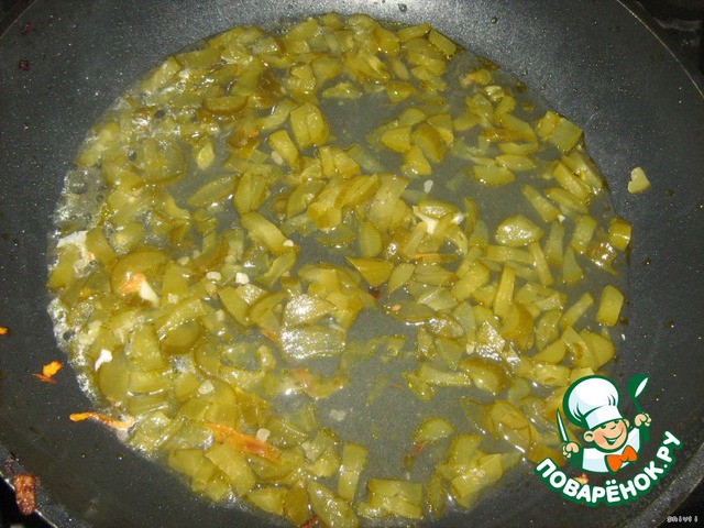 В сковороду кладем огурчики, добавляем немного рассола и бульона и тушим минут 7-10 минут, пока овощи кипят в бульоне.