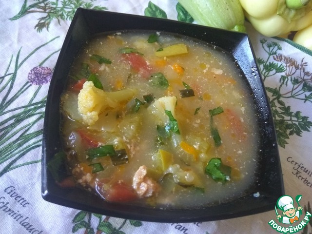 Затем бросаем в кастрюлю и капусту с кабачками. Только не забудьте кабачок нарезать, а капустку разобрать на соцветия.