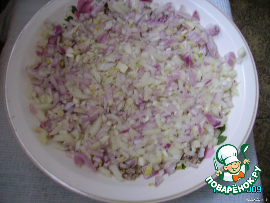 2. выложить заранее замаринованный лук (лук залить водой, дoбавить соль и 5 ст. л. уксуса, оставить на 40 мин.).