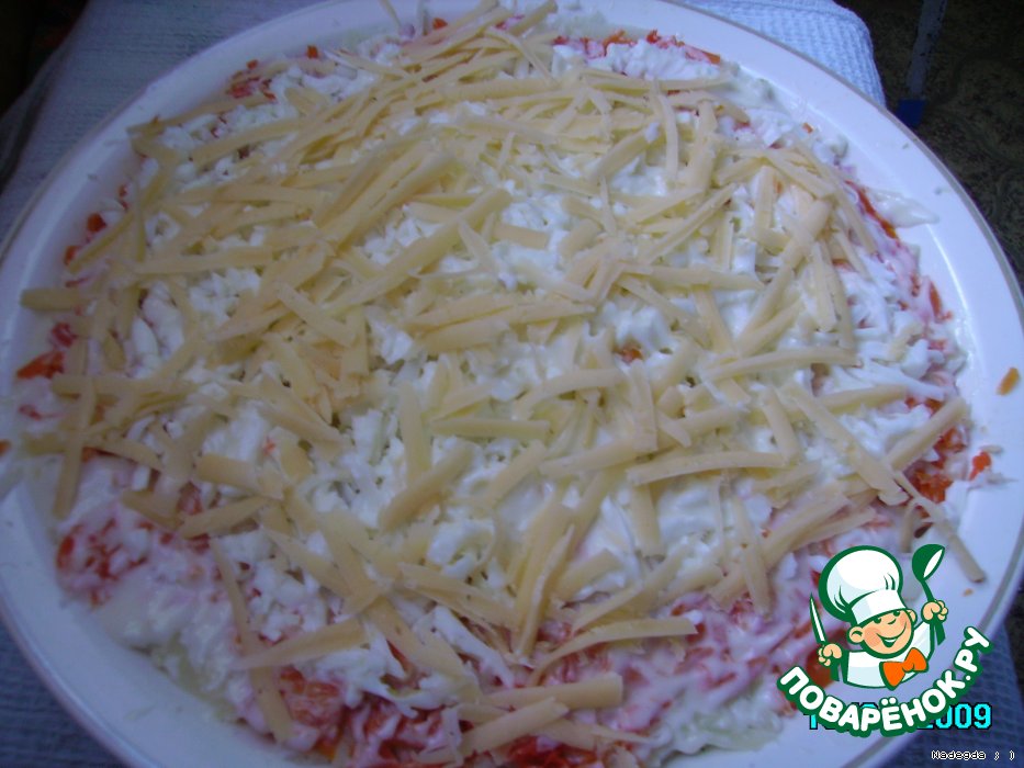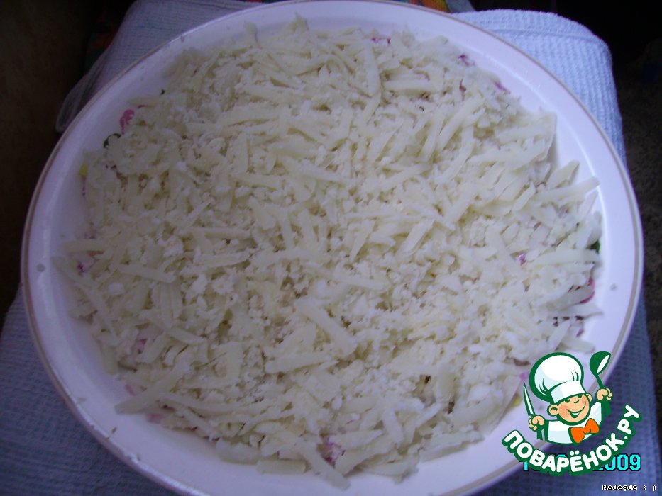 Салат состоит из отдельных слоeв, каждый из которых промазывается майонезом.