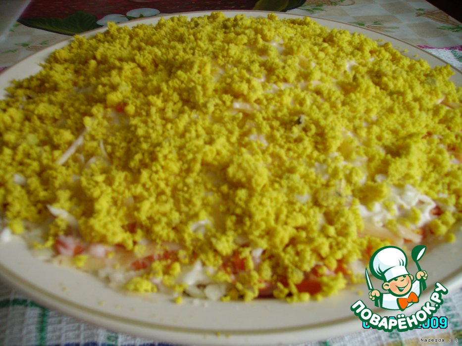7. Желтки разминаются вилкой и выкладываются последним слоем.