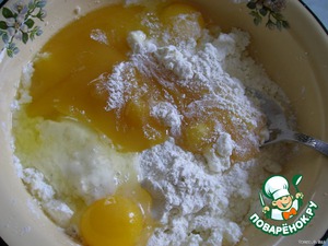 Добавить муку, 2 яйца, мед и тщательно вымешать тесто.