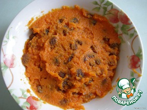 Морковь отварить, почистить, протереть через сито или блендером, добавить распаренный изюм и перемешать.