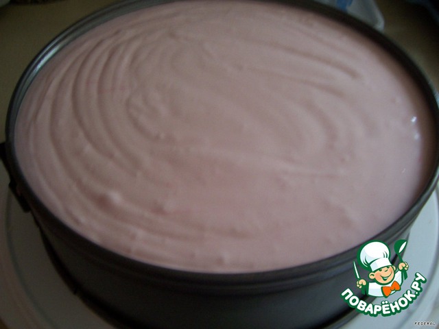 Берём кольцо от разъёмной формы, кладём один корж, заливаем суфле и накрываем вторым, ставим в холодильник на 2 часа.