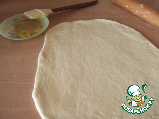 Раскатываем лепёшку. Припылите немного муки на стол. Теперь лепешку смажем хорошо маслом растительным и свернём рулетом.