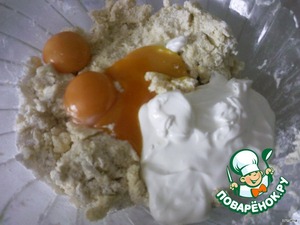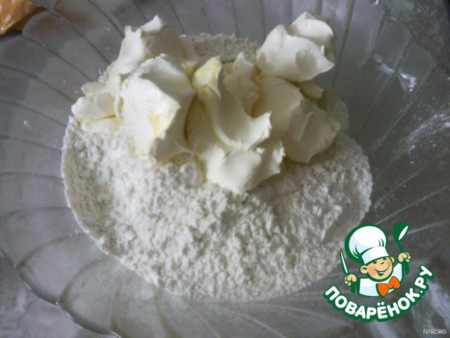 В муку добавляем пекарский порошок, мягкий маргарин, сахар и вымешиваем. -