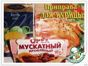 - Специи (приправа для курицы,карри,мускатный орех,соль,перец-по вкусу)
