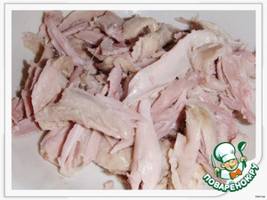 Заранее отварить курицу, разделать на кусочки