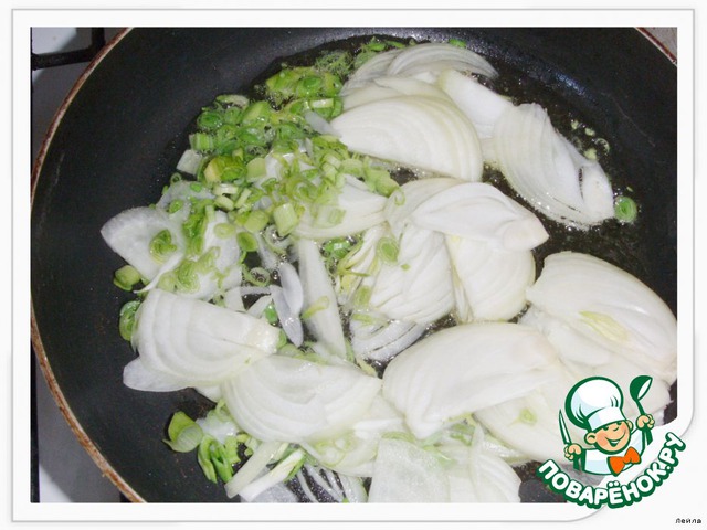 Лук,1 веточка свежего чеснока, нашинковать, пожариь до золотистого цвета