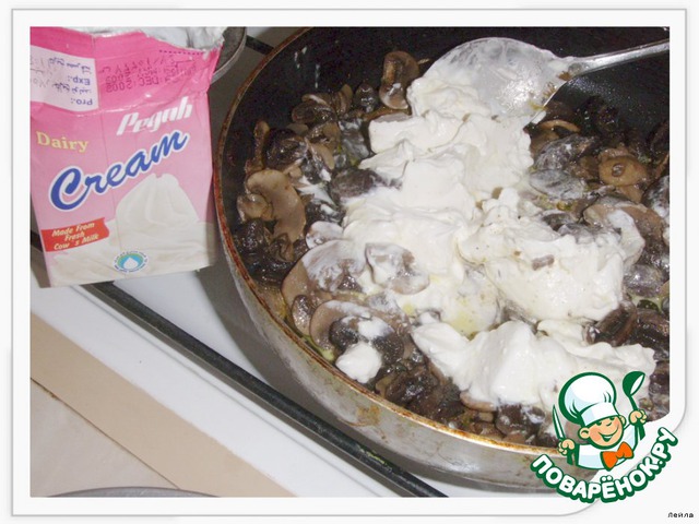 После добавить мускатный орех (щепотку), специи. Добавить сливки, мин 2-3 обжарить, остудить