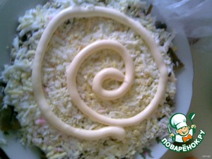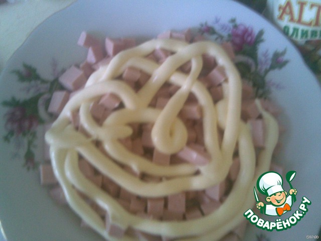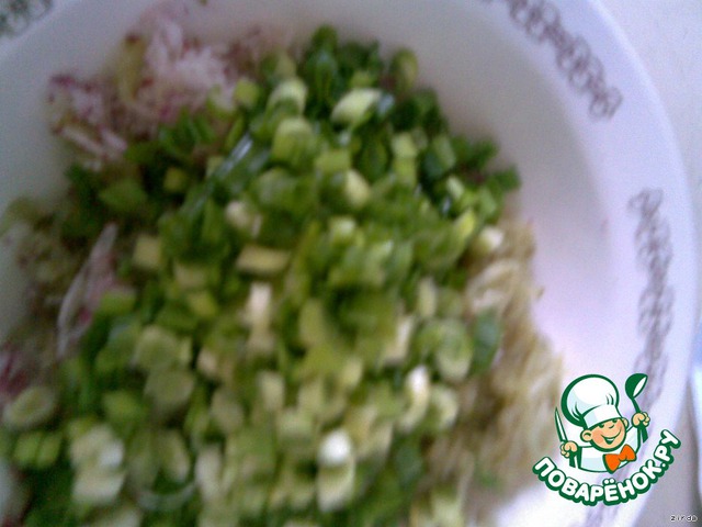 Мелко режем лук, зелень, добавляем 1 ст. ложку острой горчицы (лучше домашней, собственного производства) и добавляем майонез.