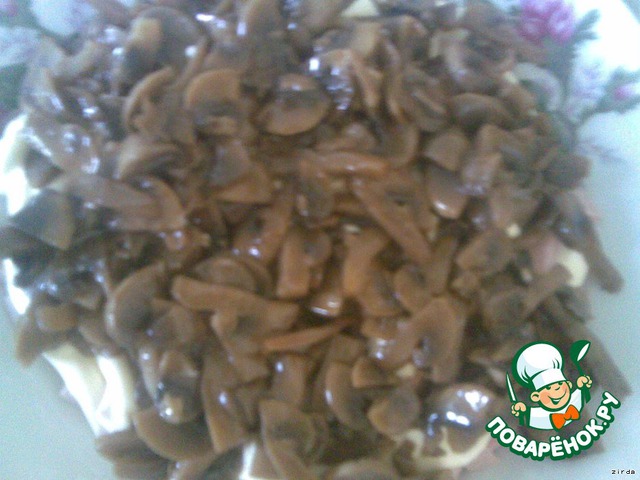 • Обжариваем грибы на подсолнечном масле, чуть присаливаем и перчим. Остужаем и это - 3 слой