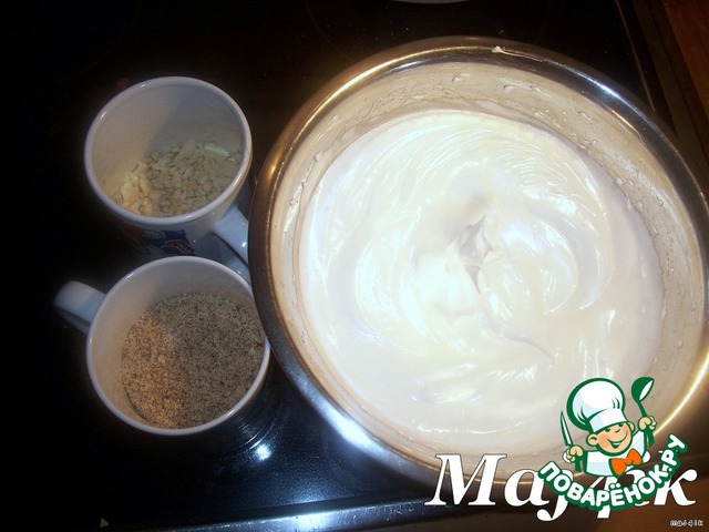 Белки взбить с сахаром до крепких пиков.